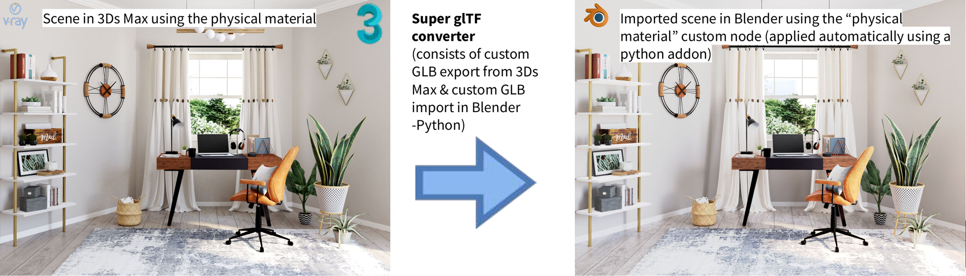 Equivalence of shaders, lighting, post processing. This process was part of my job at nfinite and it was automated into a “GLTF Converter”. Scenes created in 3Ds Max, rendered with V-Ray, can be exported to Blender and Rendered with Cycles seamlessly thanks to this tool. Even nodes such as “color correction” in the material nodes were covered: equivalent node groups were created for everything in Blender. The 3d artists who were used to working in 3Ds Max, could easily manipulate a scene imported in Blender using this tool. As an example, the confusing math of creating equivalent light units was hidden in node groups, alowing the user to work in the same Units as in 3Ds Max and even go back and forth from each software.